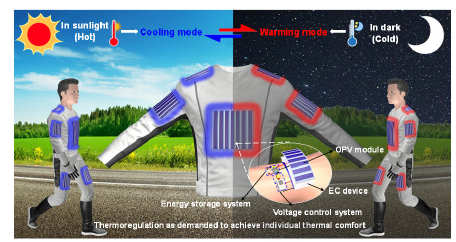 該系統(tǒng)能夠通過柔性太陽能器件,將太陽光的能量用于驅(qū)動高效的電卡熱管理器件,使人體熱舒適區(qū)從22—28°C擴(kuò)展到12.5—37.6°C。同時具備能耗低、效率高的特點(diǎn),只需12小時的太陽光能量輸入,便可實現(xiàn)24小時可控和雙模式體溫調(diào)節(jié),具有很強(qiáng)的自適應(yīng)能力。